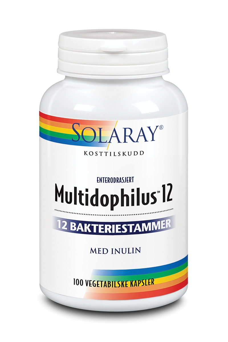 En sunn tarmflora er nødvendig for kroppens næringsopptak, avgiftning og utskillelse av avfallsstoffer. Solaray Multidophilus 12 inneholder 10 milliarder levende, snille melkesyrebakterier fra 12 bakteriestammer. Bakterieartene L.bulgaricus og S.thermophilus, gjennom århundrer brukt i produksjonen av yoghurt, er begge velkjente gode produsenter av melkesyre og fordøyelsesenzymet laktase. De vegetabilske kapslene er enterodrasjert slik at bakteriene først frigjøres i tynntarmen og dermed unngår å bli påvirket av magesyren.
